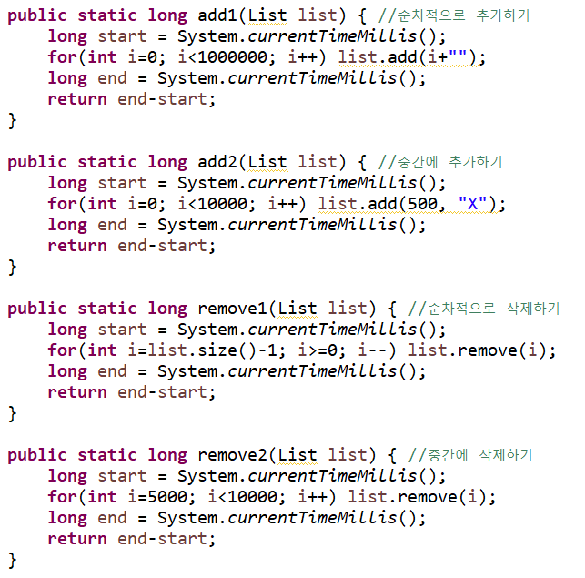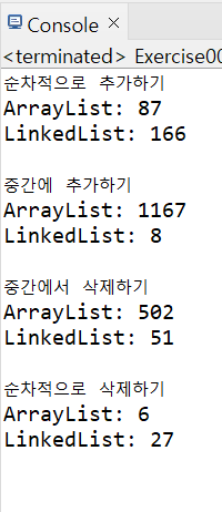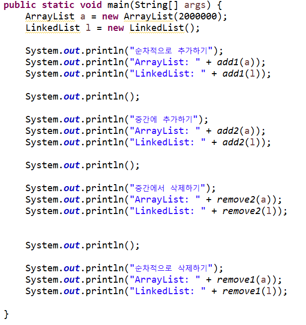 : 이번 예제는 ArrayList와 LinkedList 둘 다 순차적 또는 중간에 추가/삭제를 통해 장단점을 보는 예제이다.