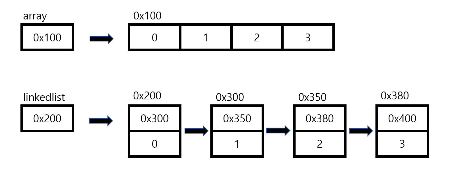 - 배열은 연속적이지만, 링크드 리스트는 불연속적으로 구성되어 있다.