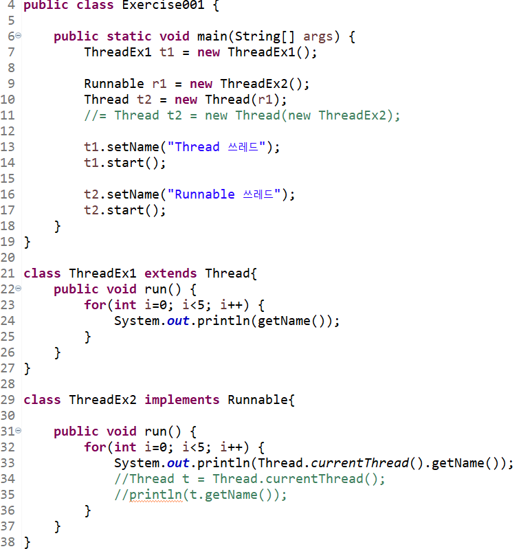 - 쓰레드 구현의 방식은 두 가지가 있는데, Thread 클래스를 상속받는 방법과 Runnable 인터페이스를