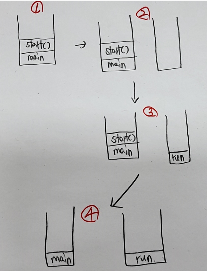 - 아래는 start()와 run() 수행 시, 일어는 과정을 설명한다.