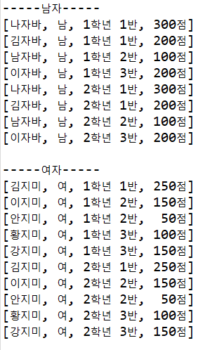 (4) 남, 녀 학생의 성별을 분할 후, 점수가 100점 이하인 학생을 출력하기.