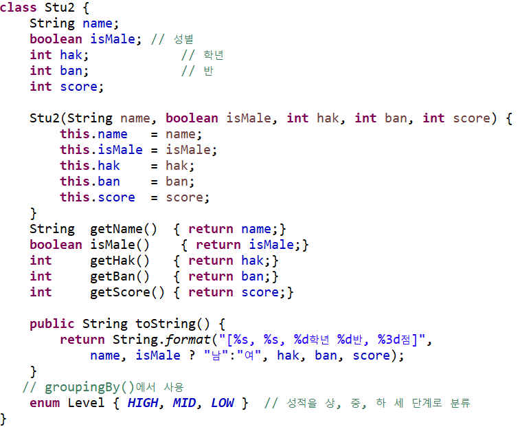 - groupingBy()는 collect() 메서드(3)에서 할 것이다.
