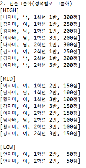 (6) 학년과 반별을 기준으로 나열하고 성적을 가지고 HIGH, MID, LOW 지정하기.