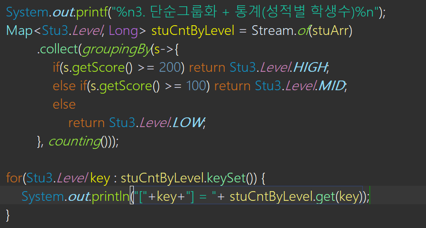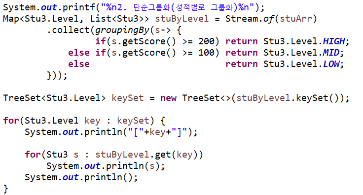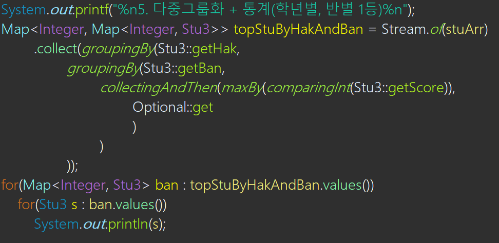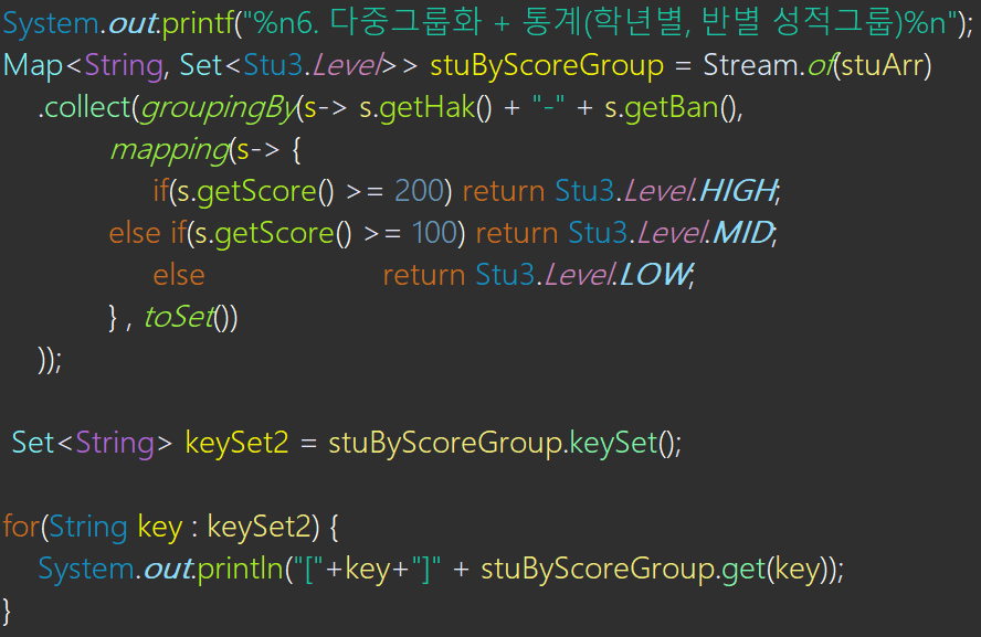 - 아래의 코드처럼 그룹화를 하면 기본적으로 List<T>에 담으며, toList()를 생략한다.