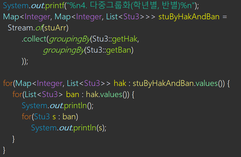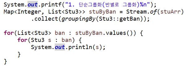Map<Integer, List<Stu3>> stuByBan = Stream.of(stuArr)