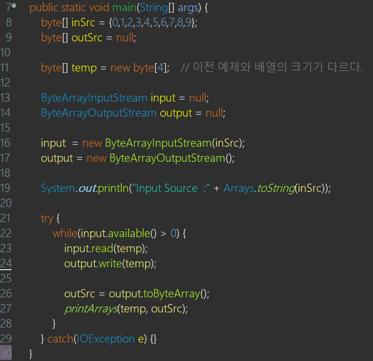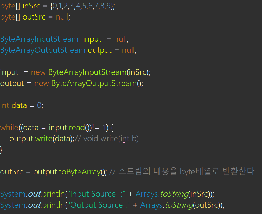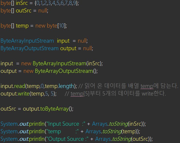 - 이 스트림은 주로 다른 곳에 입출력하기 전에 데이터를 임시로 바이트 배열에 담아서