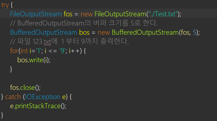 ( 그러므로, fos.close() 위에 bos.flush()나 bos.close()를 사용해야 한다. )