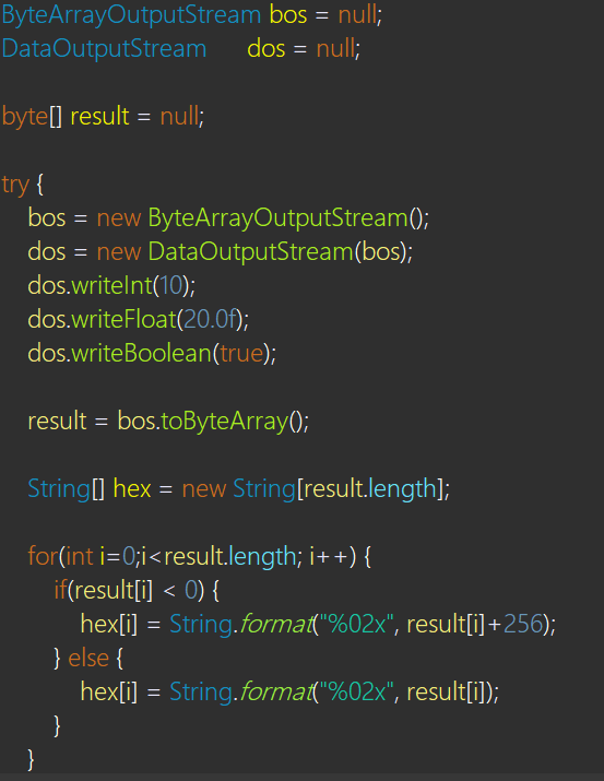 ( 출력 값에서 [0, 0, 0, 10]은 writeInt(10)이고, [65, 96, 0, 0]은 writeFloat(20.0f),