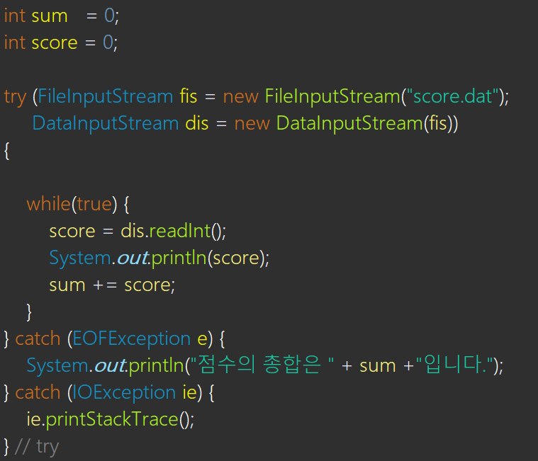 ( 올바른 코드는 catch 마지막 뒤에 finally를 사용하여 dis.close()가 필요하다. )