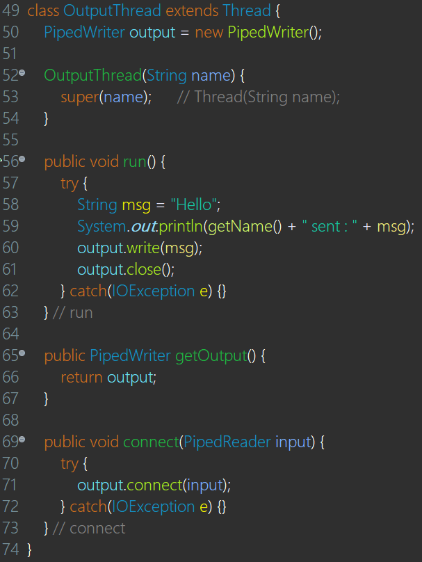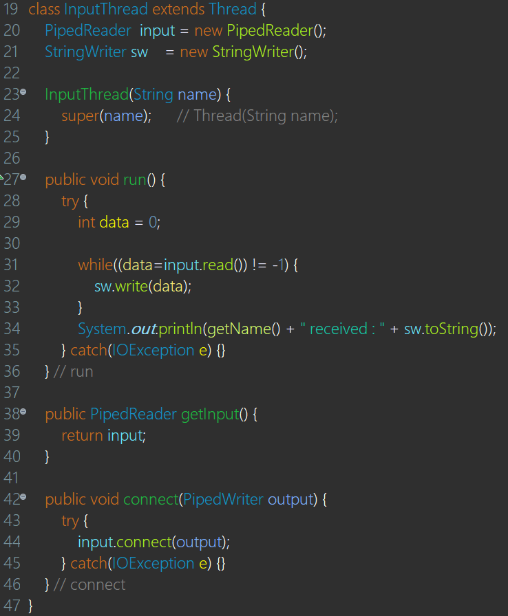 - 스트림을 생성한 다음에 어느 한쪽 쓰레드에서 connect()를 호출해서 입력과 출력 스트림을 연결한다.
