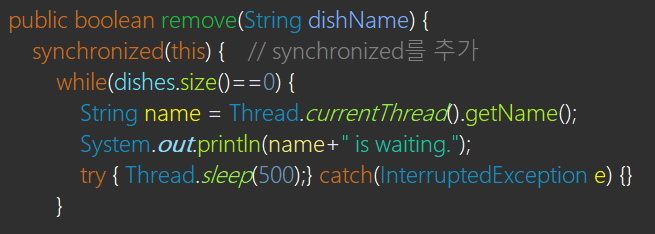 ( Table 클래스의 add()와 remove()에 synchronized를 설정하였다. )