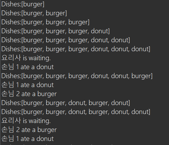 ( 첫 번째로는 요리사(Cook) 쓰레드가 테이블에 음식을 놓는 도중에, 손님(Customer) 쓰레드가 음식을