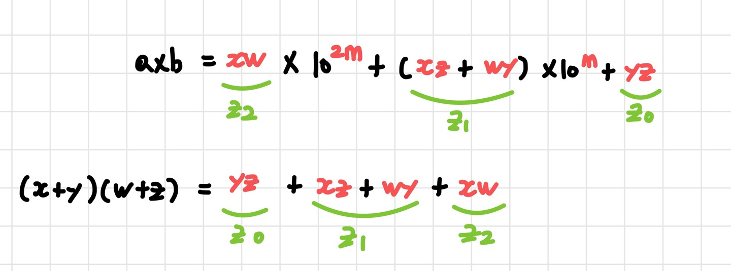( 여기서 카라츠바가 발견한 것은 아래와 같이 네 번 대신 세 번의 곱셈만으로 표현할 수 있는 것입니다. )