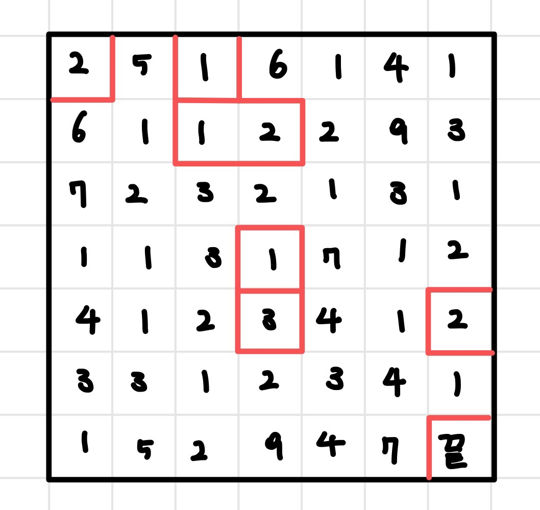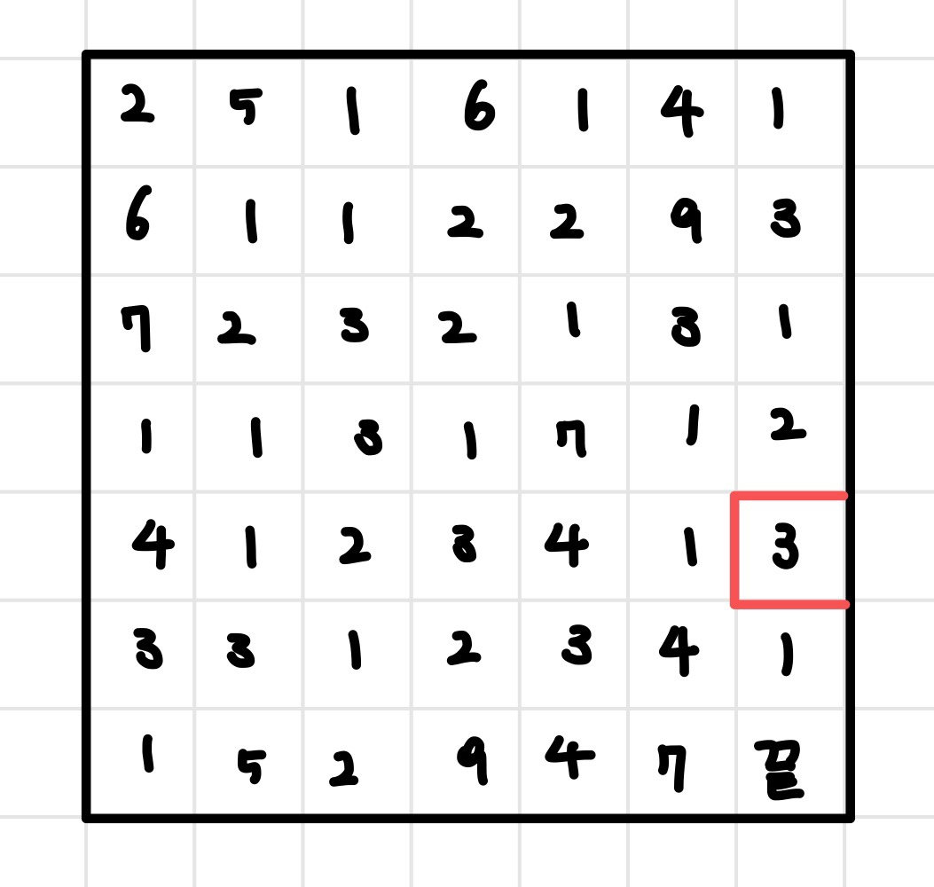 (3) 이때 각 칸에 적혀 있는 숫자만큼 아래쪽이나 오른쪽으로 이동할 수 있으며, 중간에 게임판 밖으로 벗어나면 안 된다.