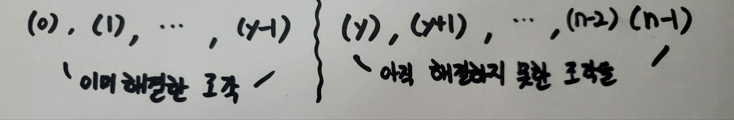| 1 | y와 x는 재귀 호출이 풀어야 할 부분 문제를 지정한다. 이 두 입력이 정해지면 앞으로 우리가 만들 수 있는 경로들이 정해진다. 따라서 이들은 앞으로 풀어야 할 조각들에 대한 정보를 주는 입력이다. |