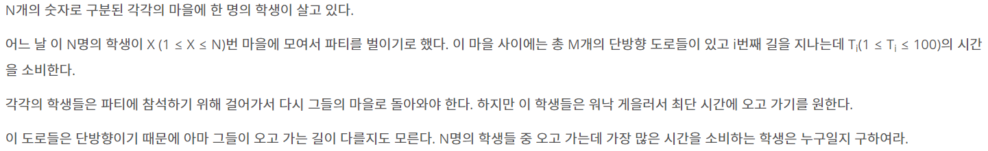 첫째 줄에 N(1 ≤ N ≤ 1,000), M(1 ≤ M ≤ 10,000), X가 공백으로 구분되어 입력된다. 두 번째 줄부터 M+1번째 줄까지 i번째 도로의 시작점, 끝점, 그리고 이 도로를 지나는데 필요한 소요시간 Ti가 들어