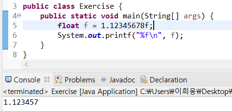 - %f: 기본적으로 소수점 6자리까지만 출력 (소수점 7자리에서 반올림)