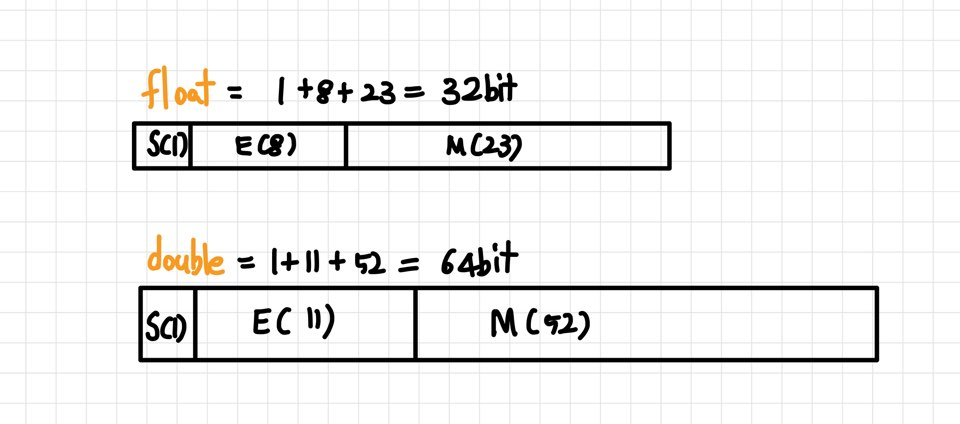 - E는 지수이며, float는 -127 ~ 128, double은 -1023 ~ 1024의 범위를 가진다.