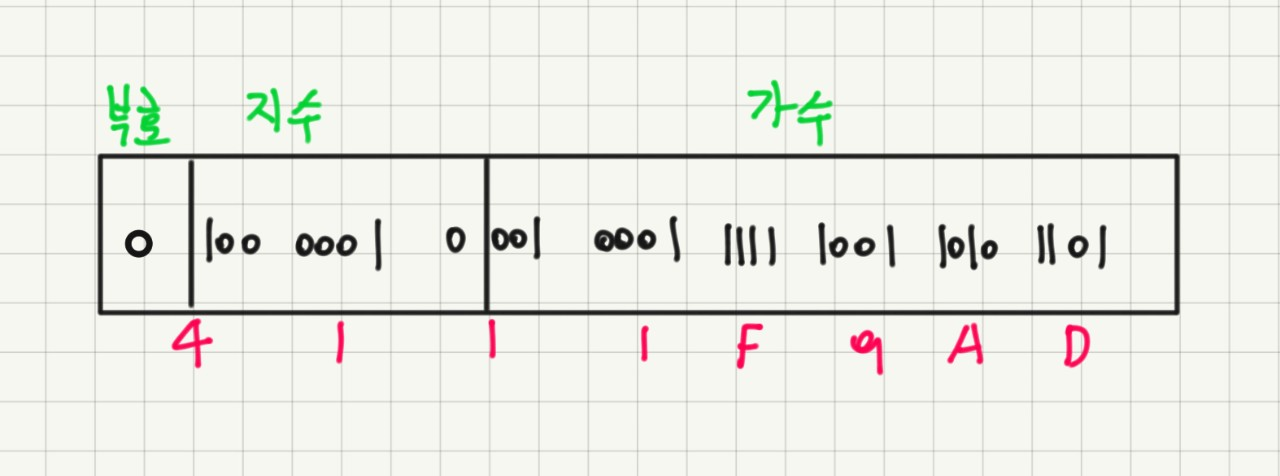 - S는 부호 비트이며, 0이면 양수 1이면 음수를 나타낸다. 또한 양의 실수에서 음의 실수로 변환할 때, 정수형과 달리