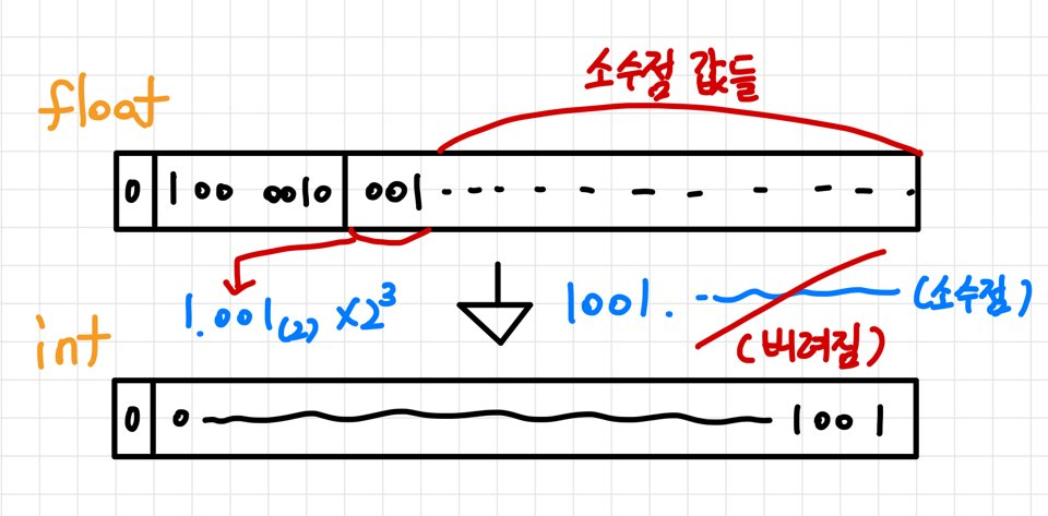 약 7자리의 정밀도만 제공하므로, int를 float로 변환할 때 정밀도 차이에 의한 오차가 있음을 알자.)