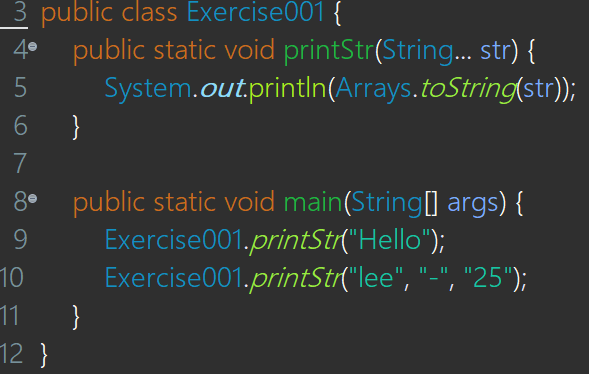 ( 위 예제는 오버로딩을 구현했는데, 계속 해서 매개변수를 String으로 늘린다면, 차라리 String a(String... str)