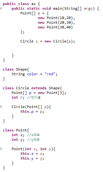 - 상속이외에도 클래스를 재사용하는 또 다른 방법이 있는데, 그것은 클래스 간에 '포함' 관계를 맺어 주는 것이다.