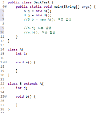 있다. 그러나, B b = new A()가 있으면, b는 인스턴스인 A를 참조하고 있기에, 인스턴스인 B에서의 멤버 j와 b()를