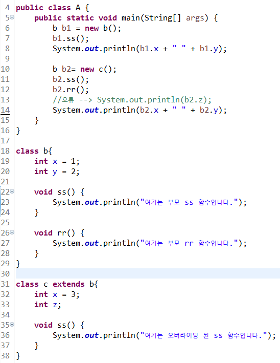 있다. 그러나, B b = new A()가 있으면, b는 인스턴스인 A를 참조하고 있기에, 인스턴스인 B에서의 멤버 j와 b()를