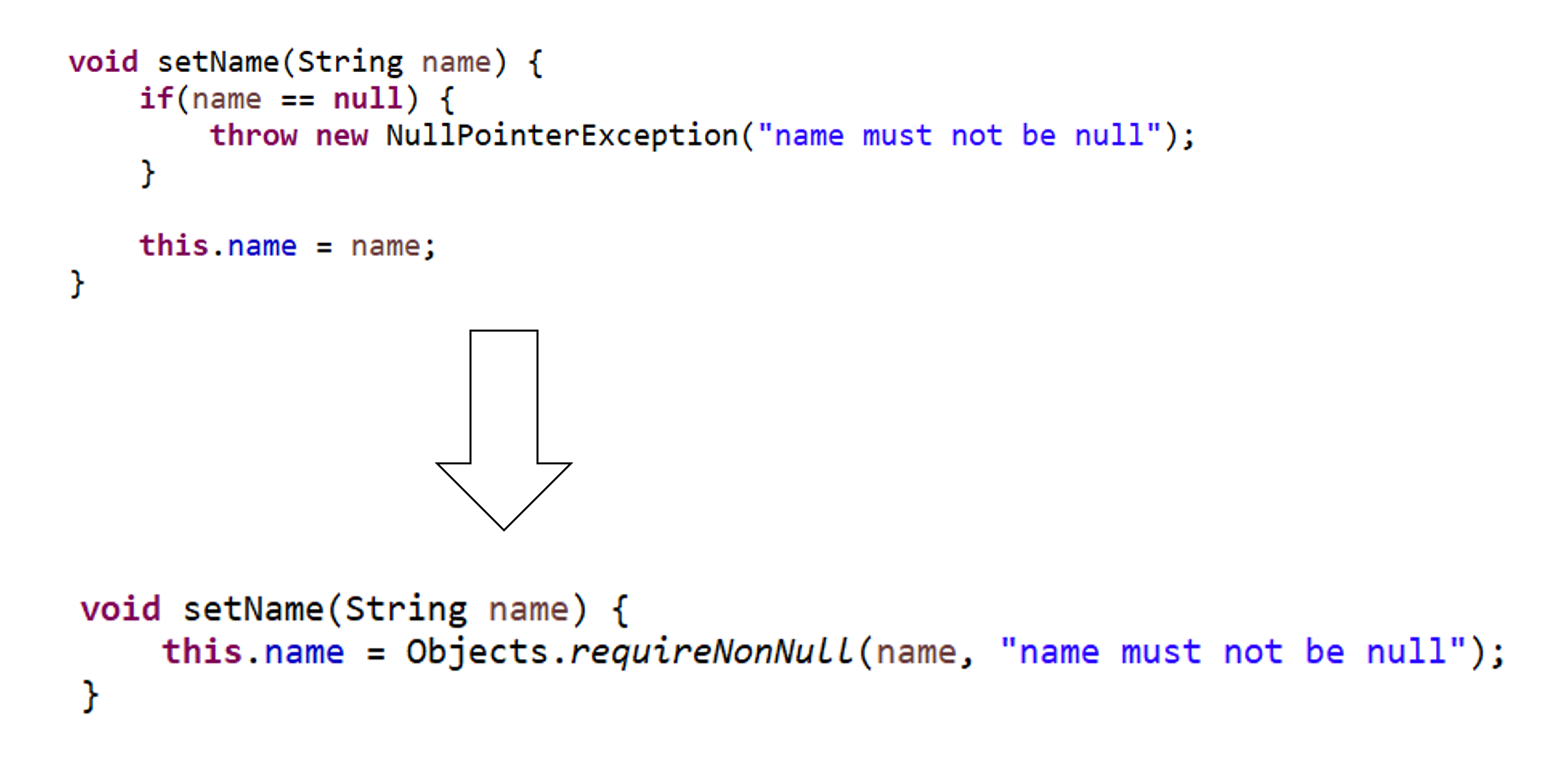 : 해당 객체가 널이 아니어야 하는 경우, 만약 널이면, NullPointerException을 발생