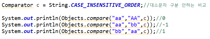 - Comparator c의 역할은 두 객체를 비교하는데 사용할 비교 기준을 잡아준다. 아래의 코드를 보고 이해하자.