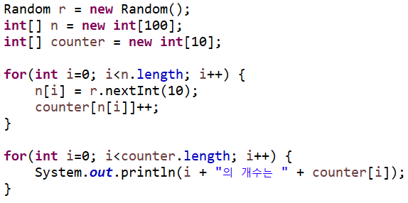 : 1~10 사이의 100개의 난수를 발생시키고 각 숫자의 빈도를 파악하는 예제이다.