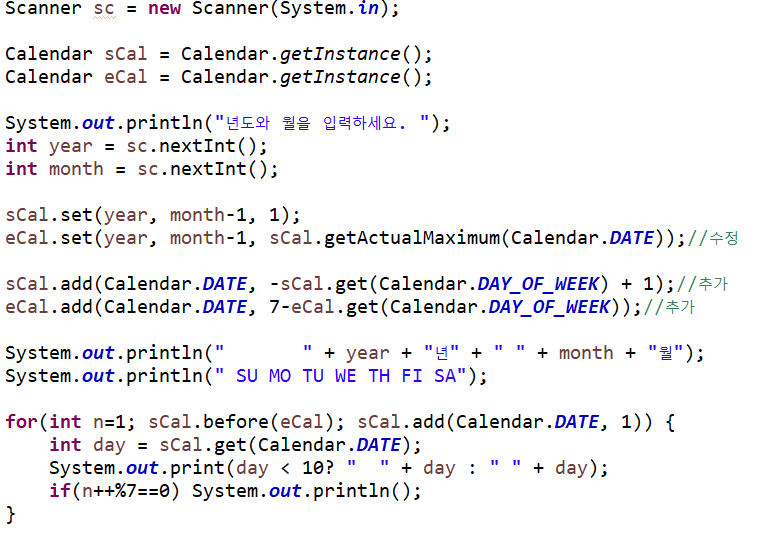 : 해당 년도와 월을 입력하게 되면 달력이 나오게 하는 예제이다.