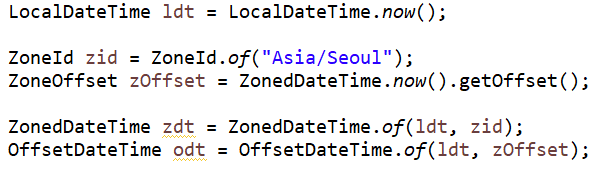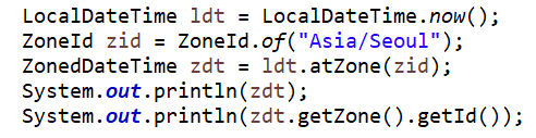 - LocalDateTime에 시간대(time-zone)을 추가하면, ZonedDateTime이 되며, 여기서는 ZoneId라는