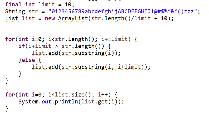 : 43개의 문자열을 10개씩 자르고 List 객체에 넣어주는 예제이다.