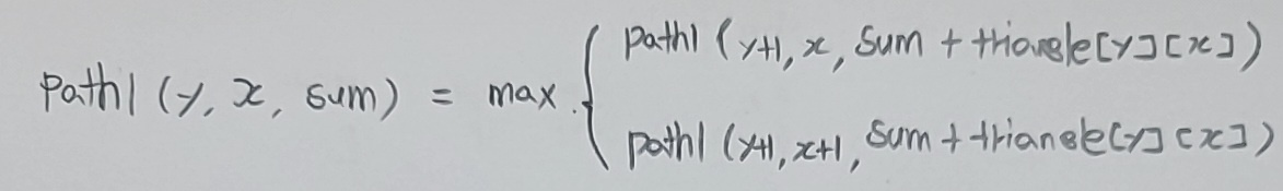 ret = triangle[y][x] + Math.max(solve(y+1, x), solve(y+1, x+1));