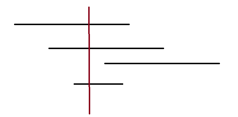 | 1차 수직선 상에서 가로 n개의 선분이 주어졌고 어떤 임의의 세로 수직선을 그었을 때, 만나는 서로 다른 선분의 개수는? |